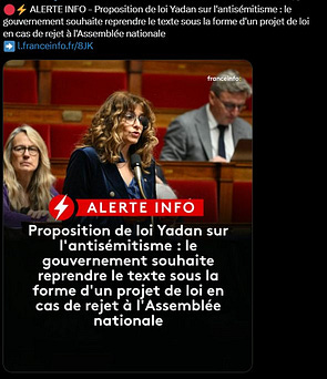 Qu’est-ce que c’est encore que cette saloperie ? Après avoir été prendre ses ordres auprès du CRIF (l’ambassade d’Israël N°2 en France), Lecornu persiste et signe. Le premier ministre de droite soutenu par le parti socialiste (qui refuse scrupuleusement de voter la censure), vient d’annoncer que si jamais la loi scélérate était rejetée ou retirée à l’Assemblée nationale, le gouvernement qu’il dirige (soutenu par le parti socialiste qui refuse scrupuleusement de voter la censure) déposerait alors un PROJET de loi reprenant les termes de la loi scélérate (dont la proposition a été signée par plusieurs députés socialistes comme François Hollande et Jérôme Guedj). Or La députée française du Likoud vient de retirer sa proposition. Il n'y a pas lieu de s'en réjouir car il s'agit purement et simplement d'une manœuvre. La différence entre la proposition scélérate de Yadan et L’infamie Lecornu, c’est qu’il pourra actionner le 49-3. Et comme les socialistes refuseront de voter la censure, le texte sera adopté tel quel. La France de Macron, de Lecornu, et d’Olivier Faure est un des PIRES PAYS DU MONDE dans la soumission aux dirigeants fanatiques de l’État génocidaire.